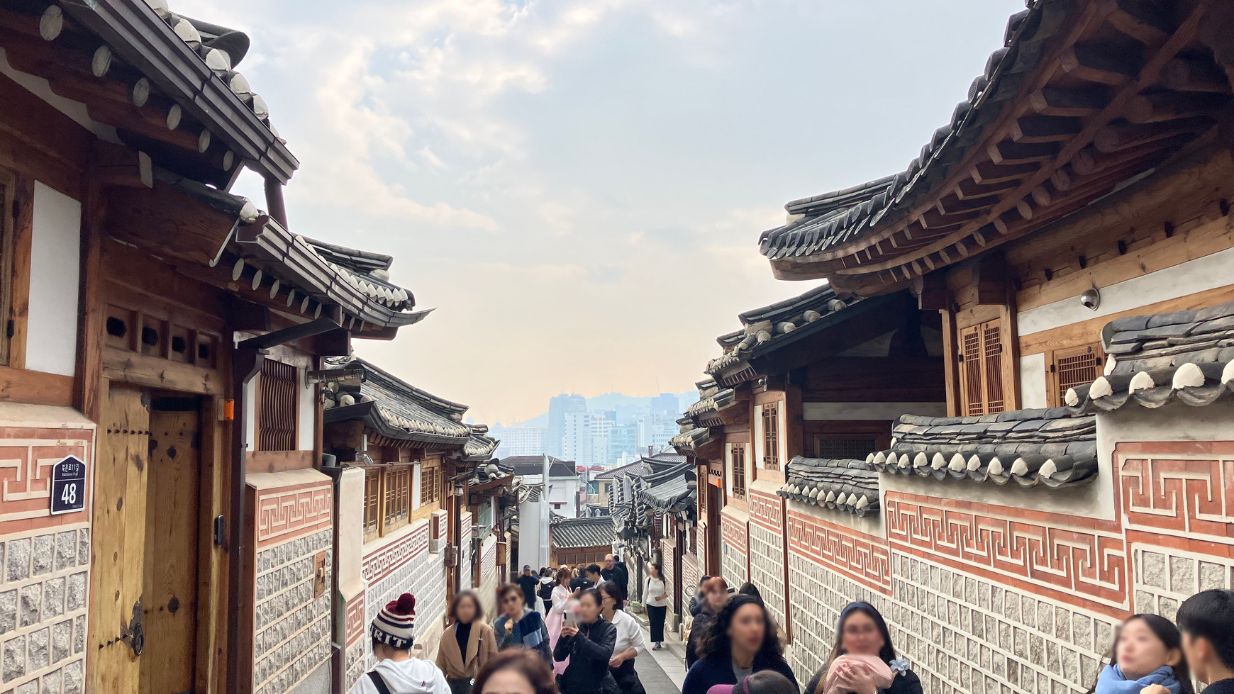 金浦空港に到着後、地下鉄を使って移動し、12時過ぎにはウルチロサガ駅に到着!ホテルに荷物を預けて、いよいよ観光へ。まず向かうのは、お決まりの北村韓屋村。この場所、映画やドラマのロケ地としても有名で、何度来ても飽きません。私自身は2回目ですが、それでも新たな発見がたくさんありました。