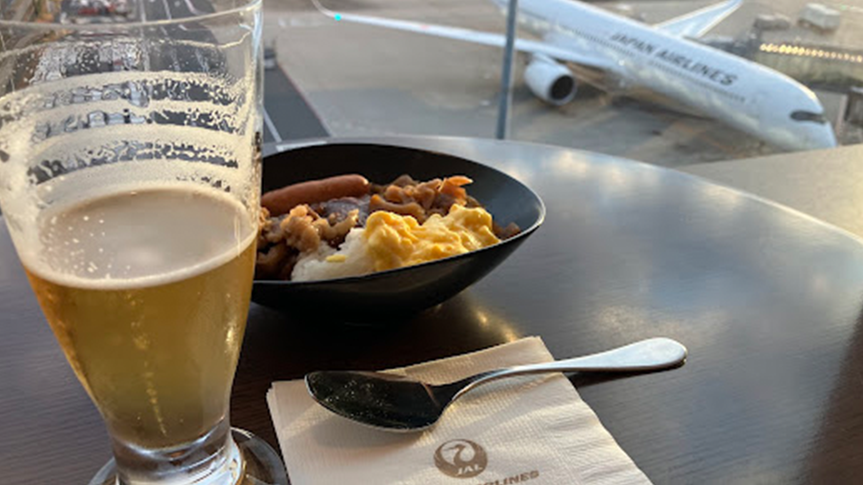 前回同様に機内食は冷たい肉系なのでラウンジでカレーとビールで気持ちを盛り上げる!