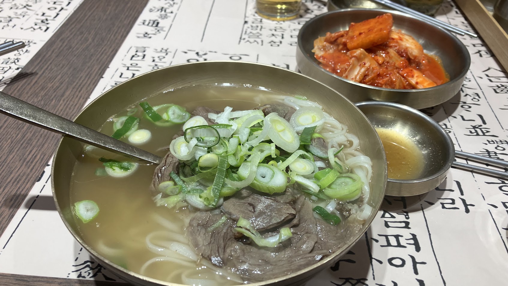 味は、手打ちの細い麺がスープに入った料理で、さっぱりとした味わい。牛肉が具材として入っていて鶏ガラベースのスープでビールに合います!