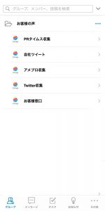 左の列に上から「グループ」「メッセージ」とあり、メッセージがラインと同じメッセージ機能となっていて、上の「グループ」という箇所が、掲示板のスレッドにあたる部分。この画像のグループは自由にテーマを作ることができ、いくつでもテーマを作成可能でテーマごとにフォルダ管理して自分様にカスタマイズすることも可能となっている。